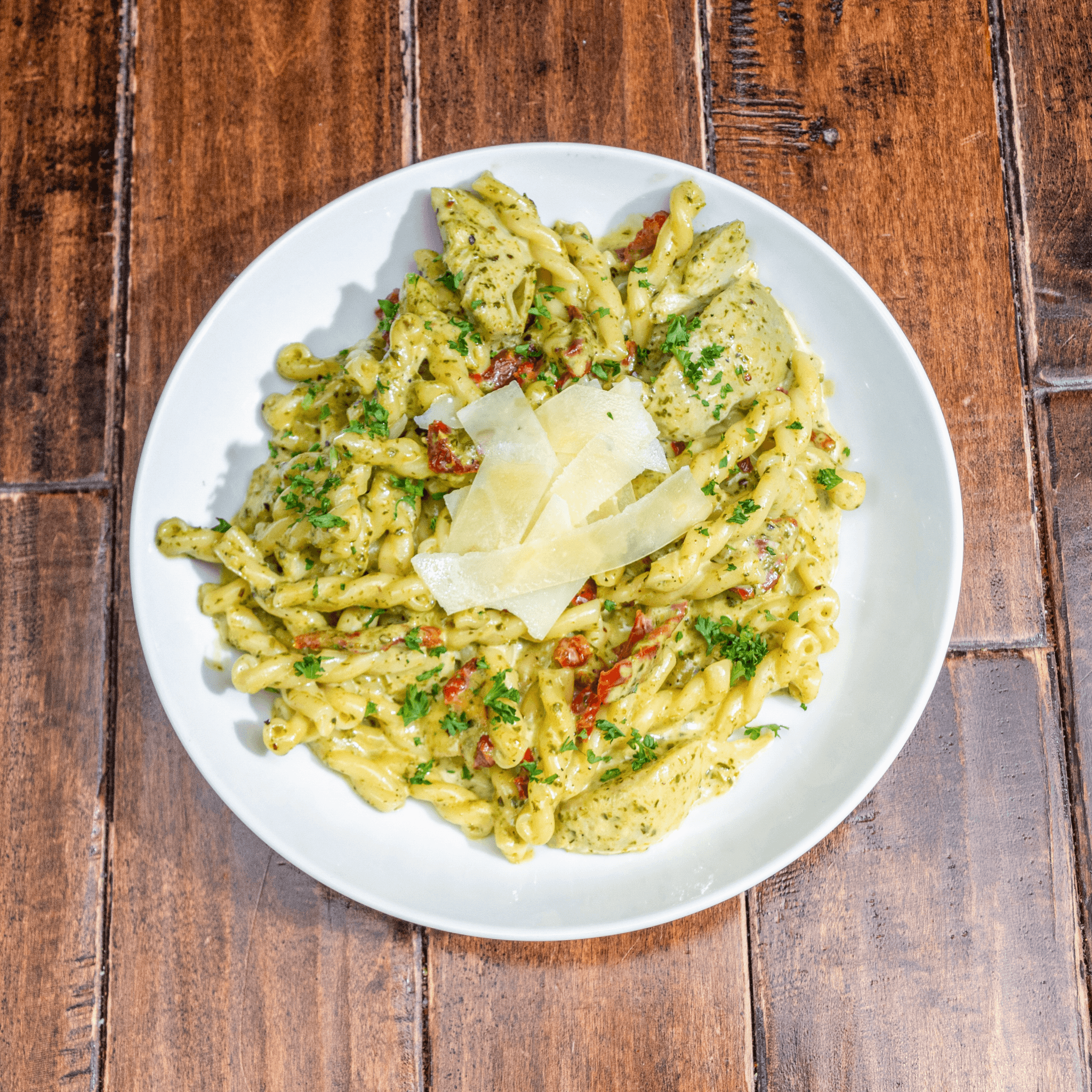 Gemelli pasta, with sundried tomatoes, artichokes, tossed in our creamy pesto sauce