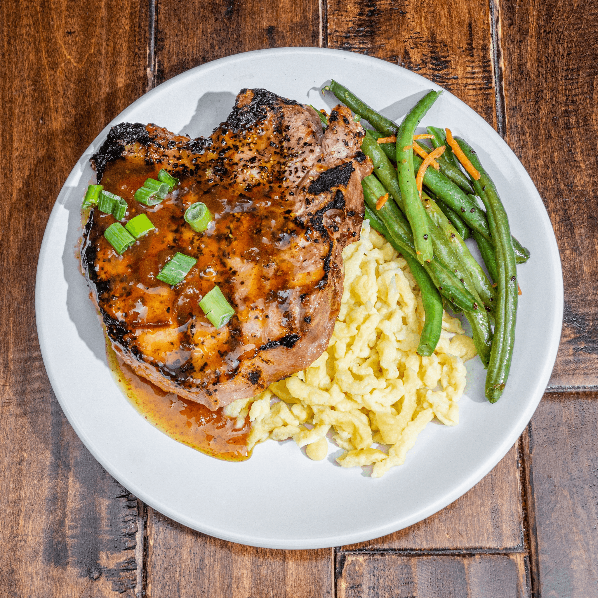 Topped with bourbon-peach glaze, served with house made spaetzle & green beans