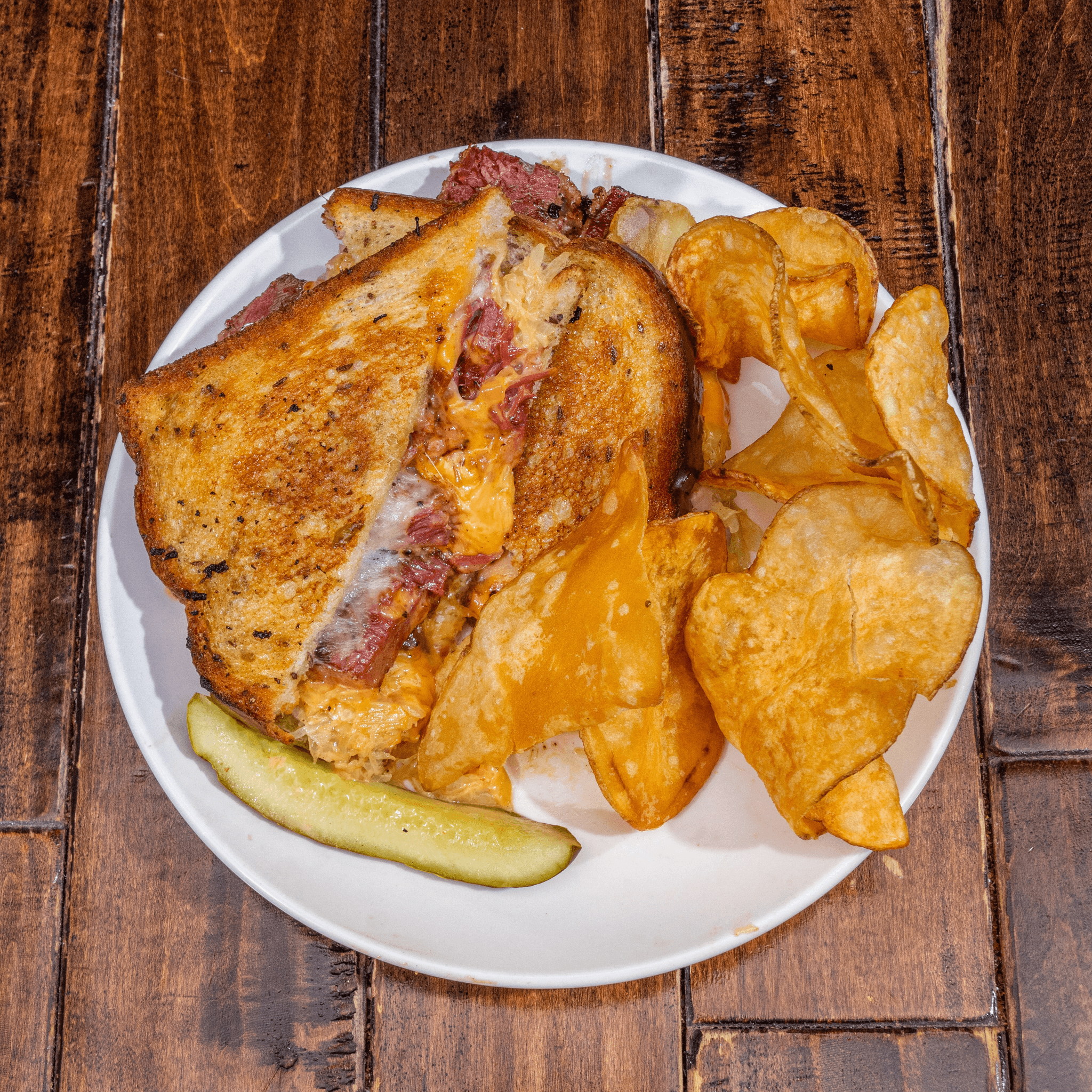 2 stacked smash patties, topped with caramelized onions, finished with our raspberry bourbon sauce, on a toasted brioche bun, served with a side of chips.