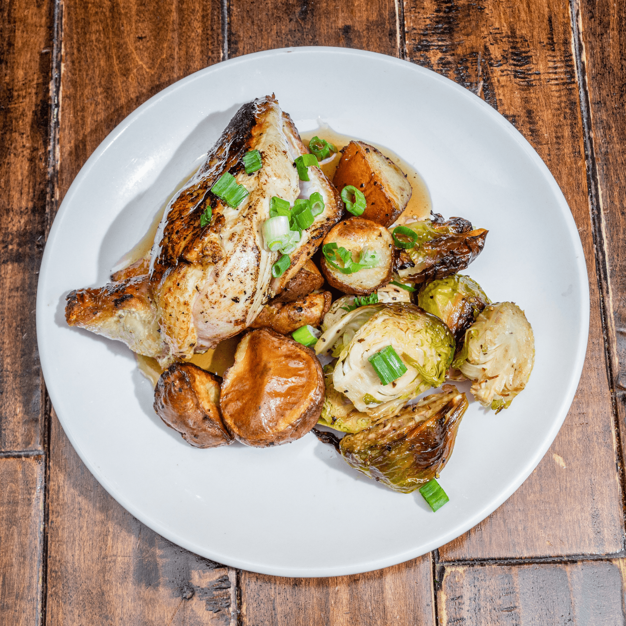 Brown butter–seared airline chicken, sage-roasted baby red potato hash, Brussels sprouts, and a maple apple cider reduction [GF]