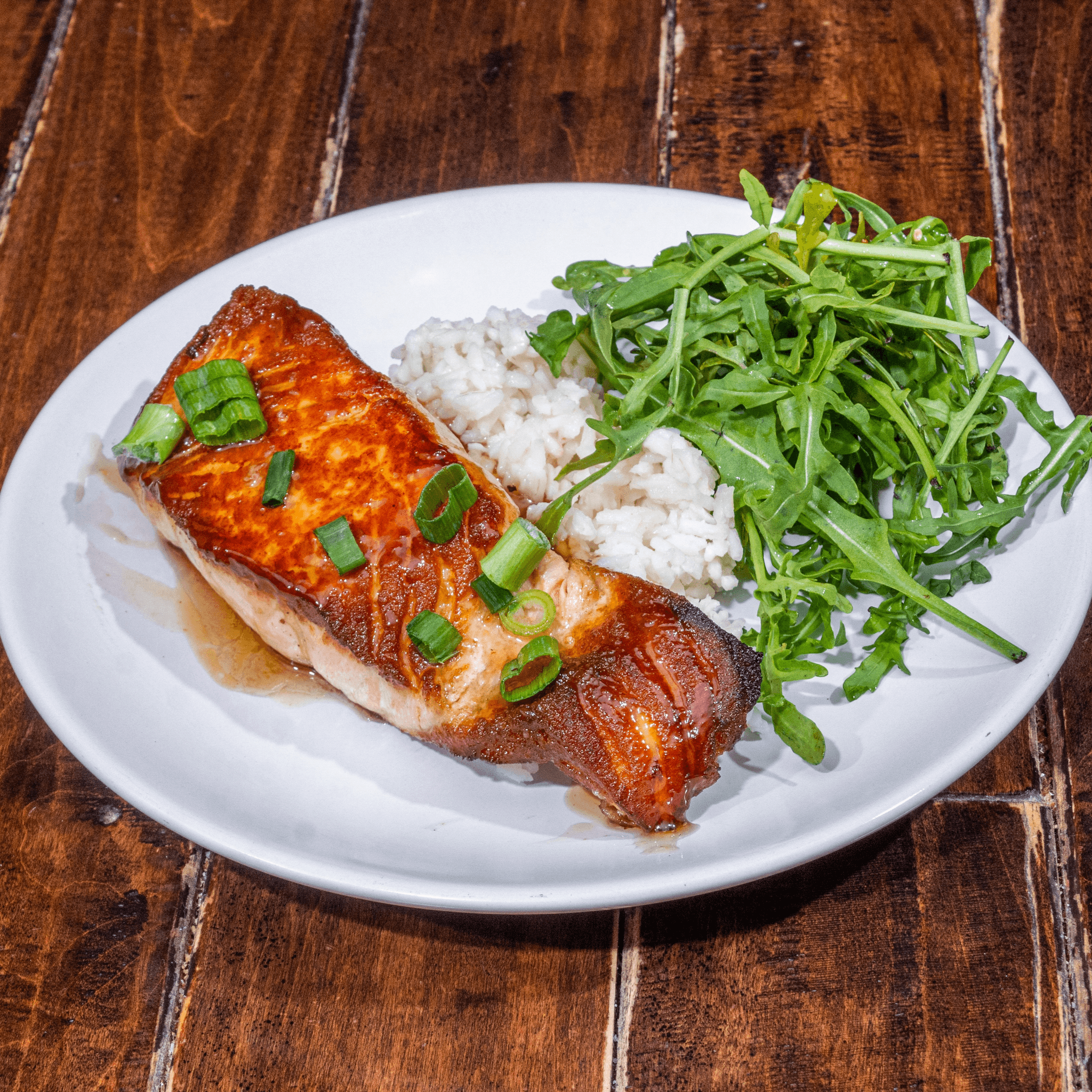 Pan-seared, maple ginger glaze, dressed arugula with lemon zest and jasmine rice