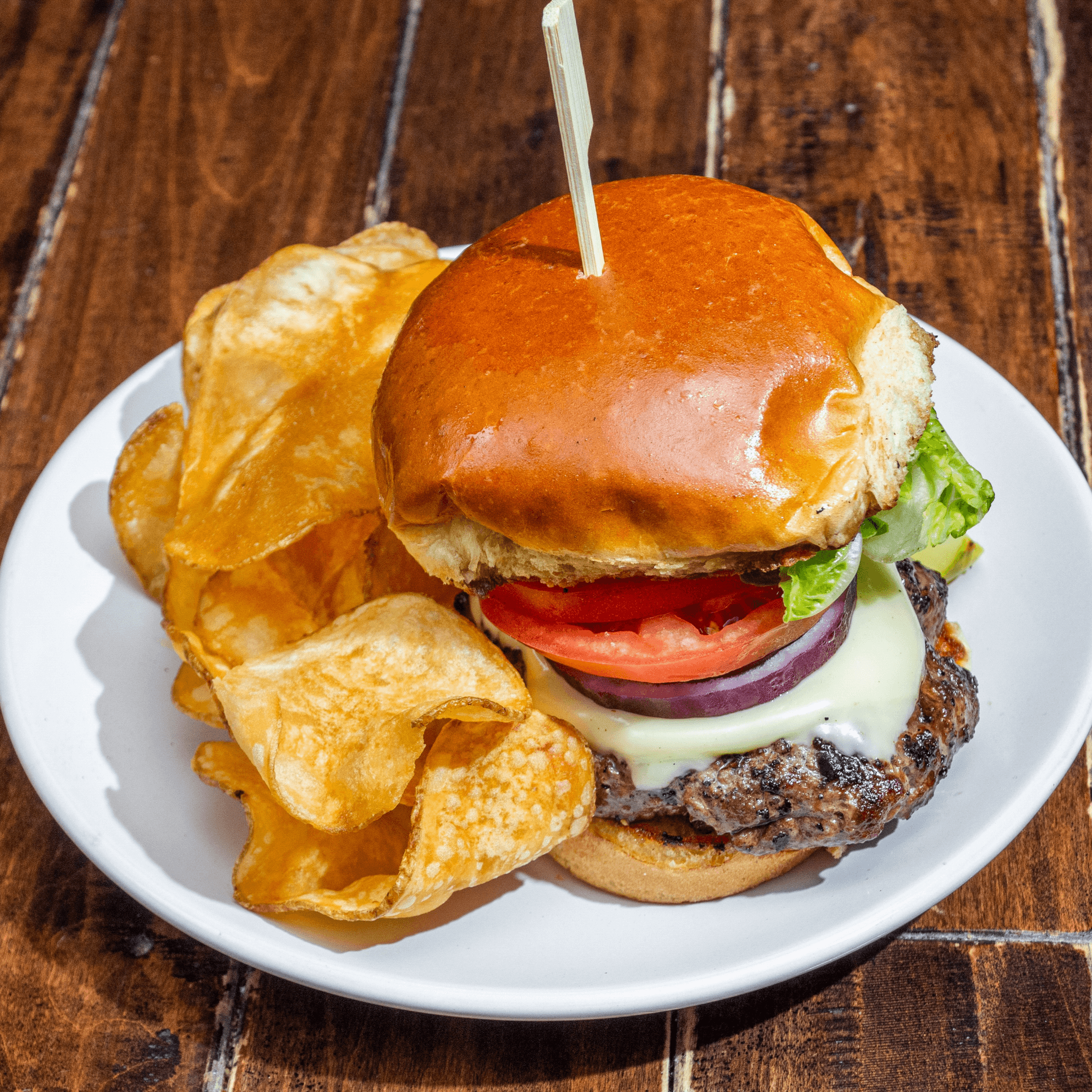 2 stacked smash patties, topped with lettuce, tomato, sliced onion, American cheese, on a toasted brioche bun, served with a side of chips